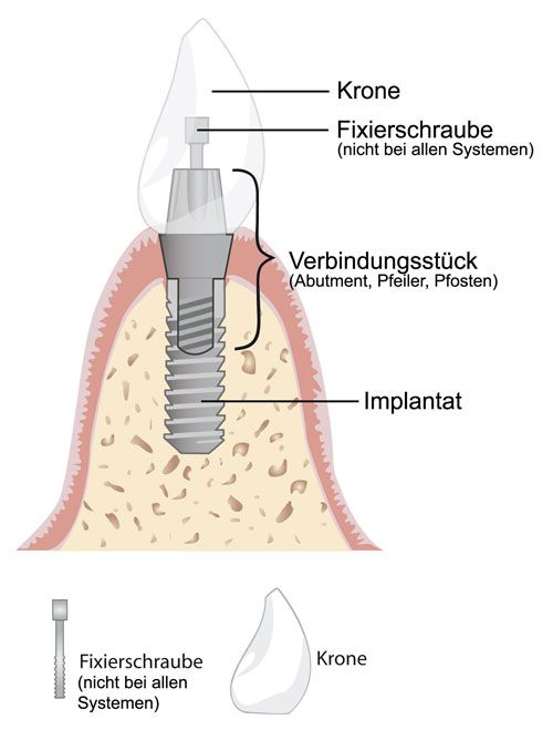 - der darauf befestigten Krone, Brücke oder Prothese (in der Implantologie allgemein als „Suprakonstruktion“ bezeichnet.